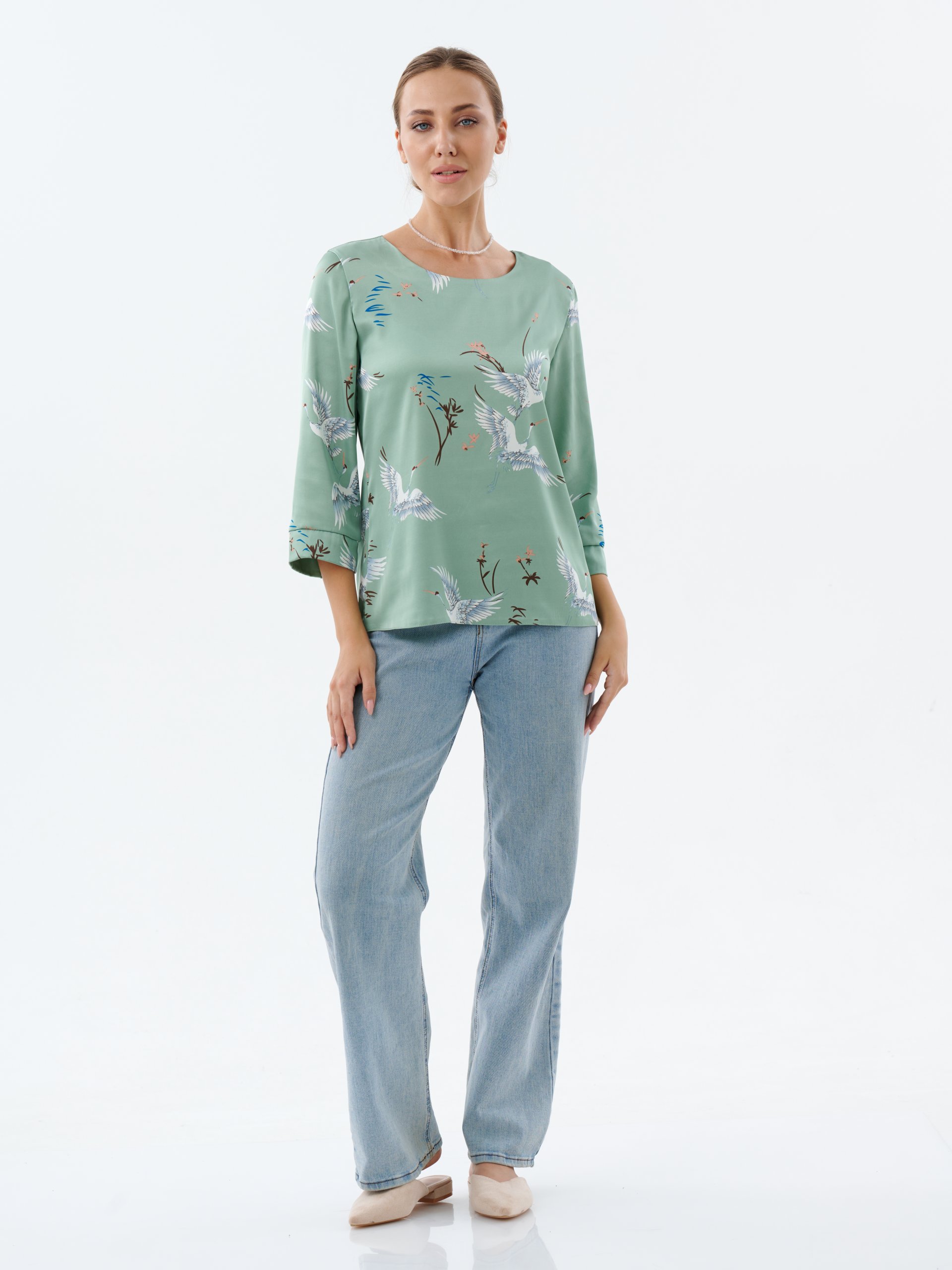 Офисная блузка прямого силуэта выполнена из шелковистой блузочной ткани. Горловина круглая обработана обтачкой. Рукава длинной 3/4 на манжете. Блузка отлично подойдет на любой случай.