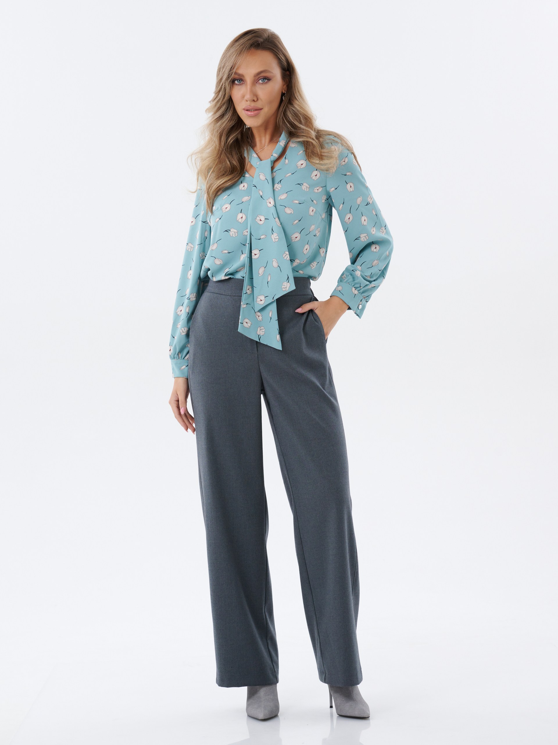 Брюки выполнены из однотонной ткани графитового цвета средней плотности. Модель прямого силуэта с высокой посадкой и свободной шириной штанины. Пояс оформлен с застежкой на пуговицу и скрытую молнию спереди, без дополнительных декоративных элементов. Карманы в боковых швах встроенные, низ изделия ровный, без манжет и отделки. Брюки сочетают комфорт текстильного материала с лаконичным дизайном, подходят для создания стильных офисных и повседневных образов