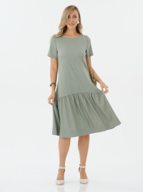 Свободное платье миди выполнено из лёгкой однотонной ткани приглушённого зелёного оттенка. Модель имеет круглый вырез горловины без застёжек и короткие рукава прямого кроя. Линия талии занижена и подчёркнута широкой присборенной оборкой, создающей лёгкий объём в нижней части платья. По боковым швам отсутствуют разрезы, общий стиль минималистичный и комфортный.