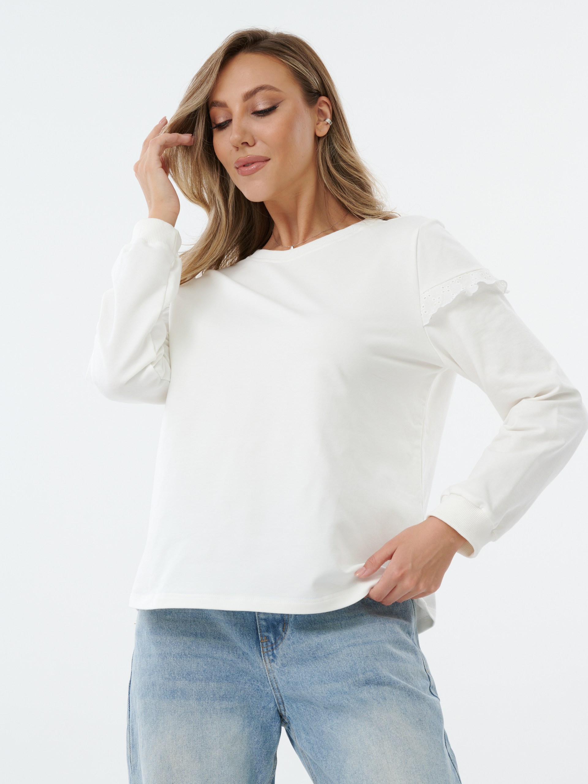 Свитшот свободного прямого силуэта выполнен из однотонной легкой ткани молочного цвета. Круглый вырез горловины, длинные рукава с небольшими декоративными воланами по плечевому шву. Нижний край и манжеты рукавов оформлены эластичной отделкой. Модель без застежек и карманов, боковые швы прямые без разрезов