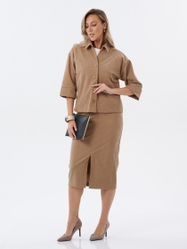 Жакет выполнен из однотонной вельветовой ткани светло-коричневого цвета средней плотности. Модель прямого силуэта с удлинённой линией плеча и свободной посадкой. Воротник классический, отложной, изделие застёгивается на крупные пуговицы по центру. Рукава укороченные, широкие, без манжет, с декоративными отворотами. Низ жакета прямой, без дополнительных отделочных элементов. Жакет сочетает комфорт мягкой вельветовой ткани с лаконичным современным дизайном, идеально подходит для создания стильных повседневных и офисных образов